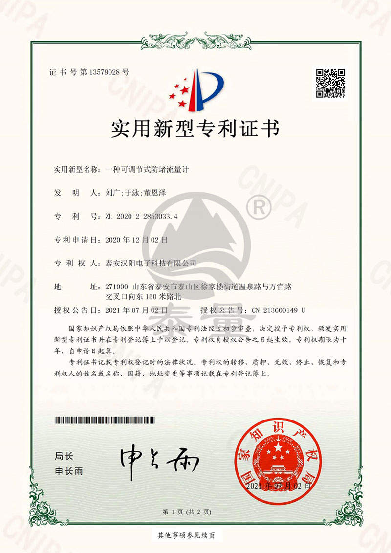 FZ20-546一種可調(diào)節(jié)式防堵流量計-證書